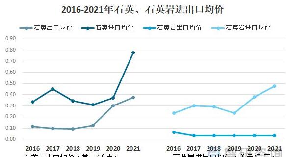 我國石英及石英巖全體進(jìn)口均價(jià)繼續(xù)領(lǐng)先,2021年進(jìn)口均價(jià)為0.69美元/千克,出口均價(jià)僅為0.2美元/千克。