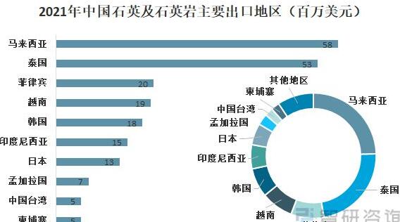 2021年我國石英及石英巖首要出口到了馬來亞、泰國、菲律賓、越南等周邊國家,其間馬來西亞和泰國的出口金額分別為58百萬美元和53百萬美元,占我國2021年石英及石英巖出口總額的24.5%和22.8%。